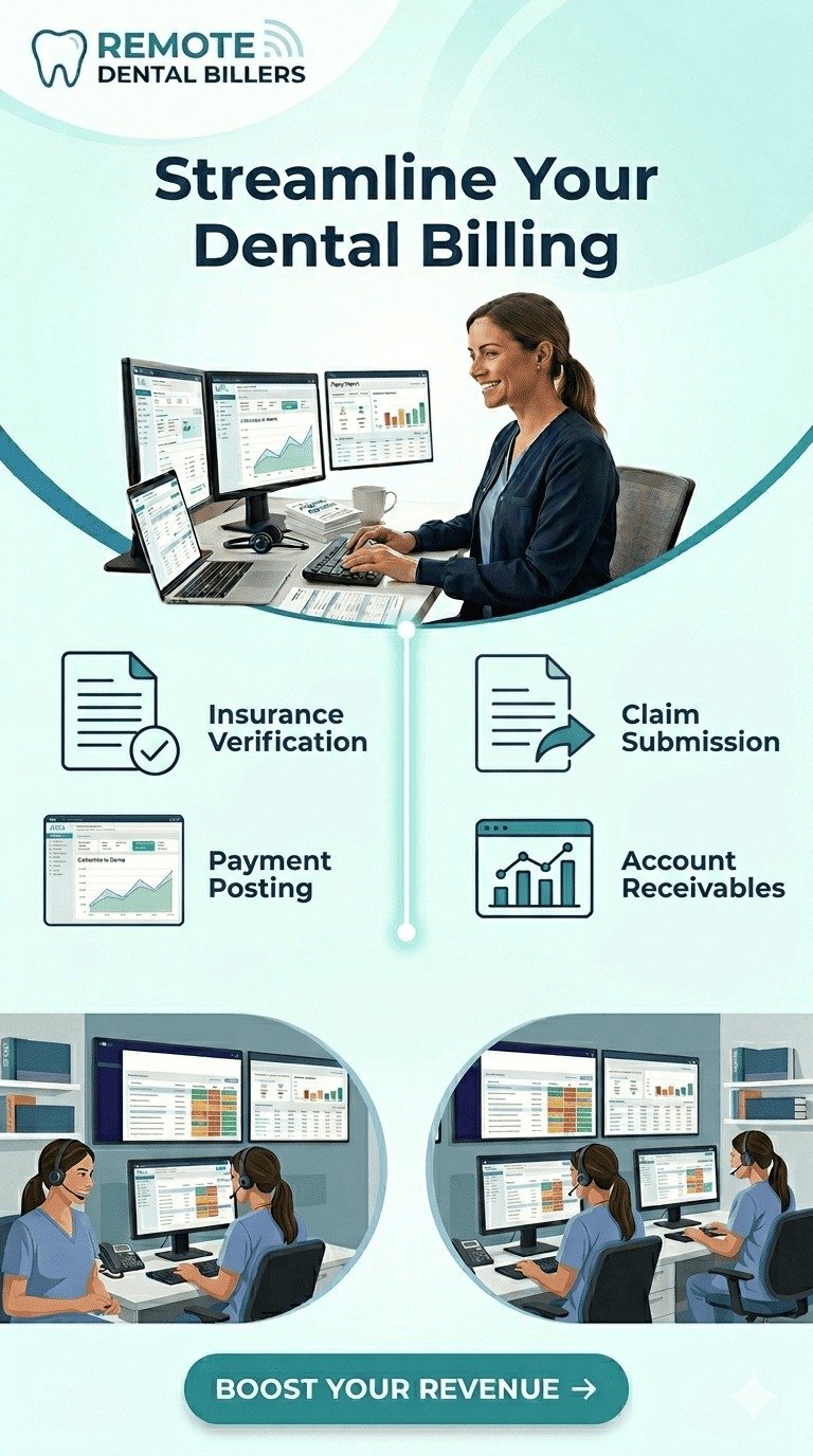 Remote Dental Billers offers a full range of dental billing services including Insurance Verification, Credentialing, Accounts Receivable Management, Payment Posting, Claims Submission, and Claims Follow-Up. Our goal is to streamline your revenue cycle and help dental practices improve cash flow while reducing administrative workload.
