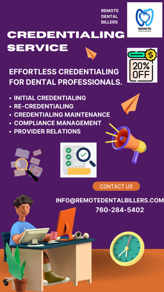 Recredentialing: Credentialing is an ongoing process that requires periodic renewal to maintain provider status with insurance networks. Remote Dental Billers facilitates recredentialing by monitoring renewal deadlines, updating documentation, and ensuring continuous compliance with evolving regulations.
